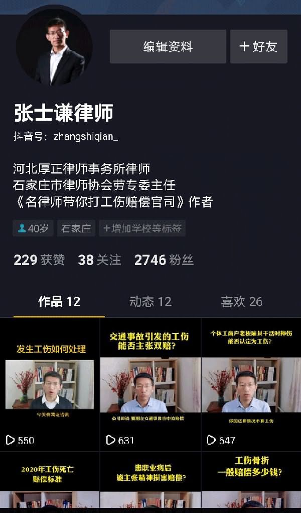 除了工伤赔偿法律网(www.ft22.com)和微信公众号(工伤法律人:gsfalvren),张士谦律师也入驻了抖音,希望能够通过更多元化的方式来为广大工伤职工解读工伤政策、计算工伤赔偿、解答工伤咨询。