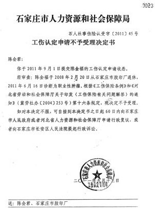 2011年9月13日,陈会君接到石家庄市人力资源和社会保障局的处理决定。