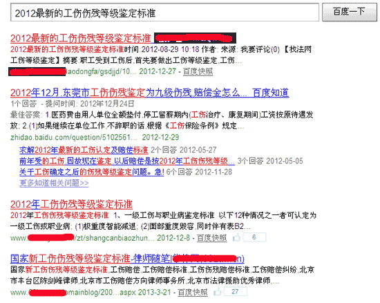 作为专业从事工伤(职业病)维权的律师,希望看到这样的改变,但却怀疑这样的消息。于是打开百度,输入“2012最新的工伤伤残等级鉴定标准”,结果如下: